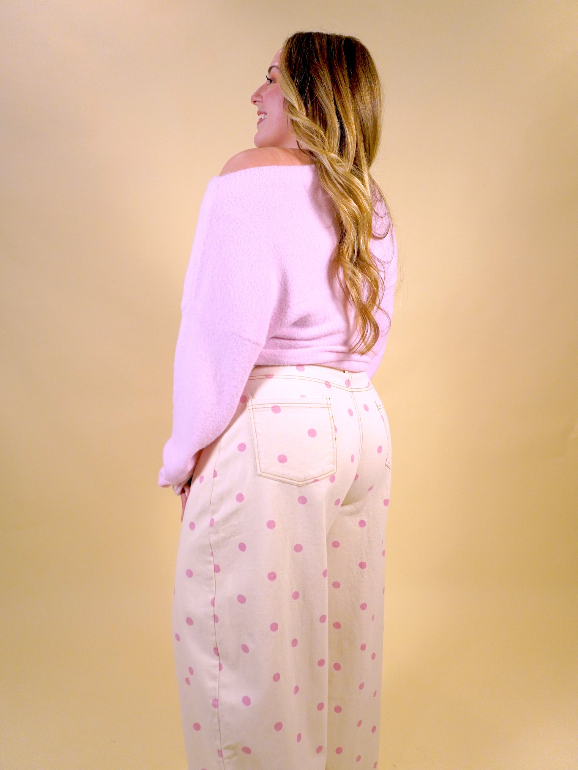 The Dottie Barrel Jeans are made for girly girls who love a statement piece. Featuring a cream denim base with pink polka dots, these jeans have a high-rise waist, super oversized wide legs, and a cropped length for the perfect playful fit. Cute and comfy, they’re ideal for teacher outfits, brunch dates, or adding a fun pop to everyday looks.