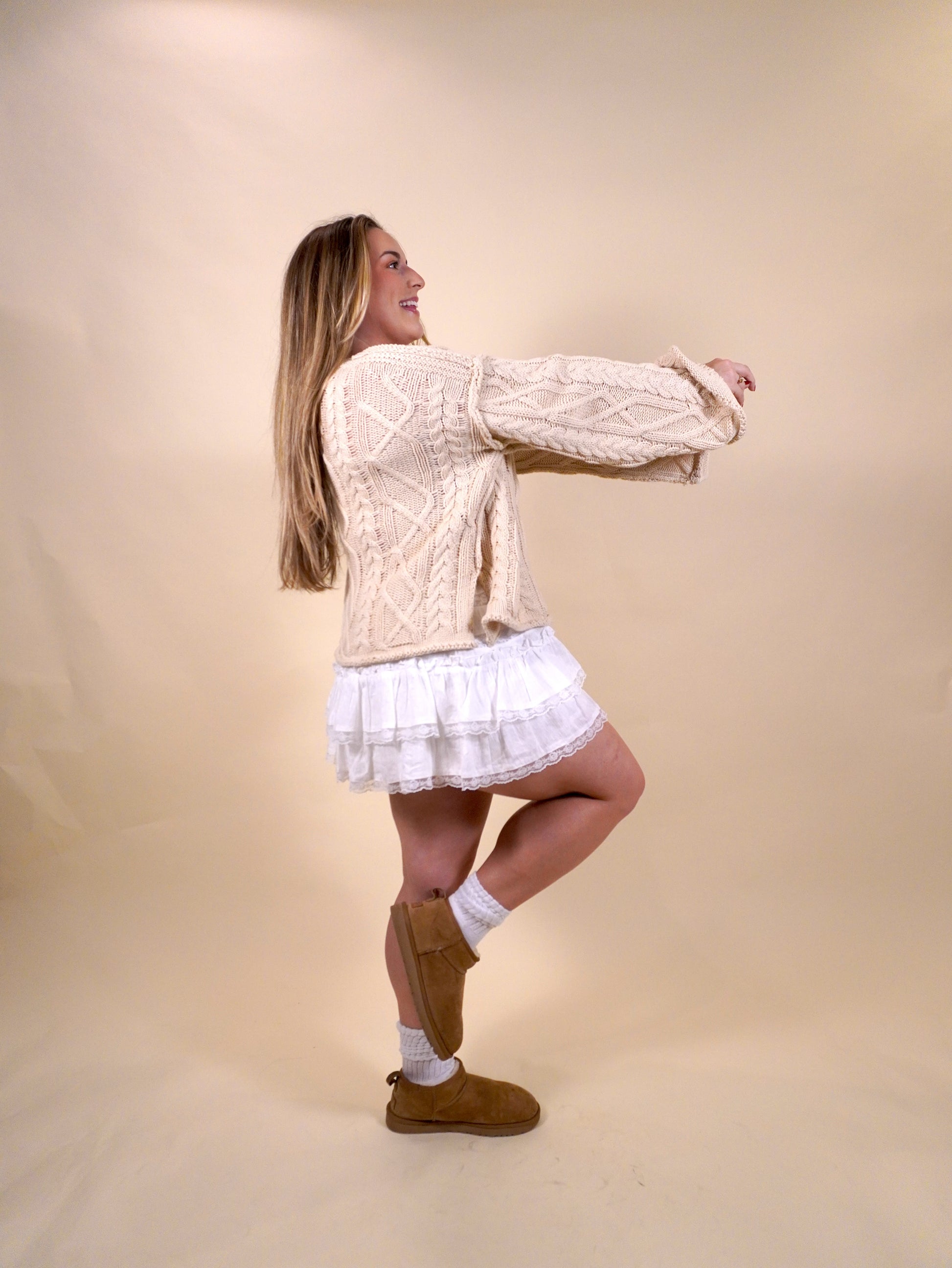 The Feeling Flirty Ruffle Mini Skirt is the kind of staple every girl needs — simple, feminine, and endlessly wearable. This white mini skirt features a comfortable elastic waistband and delicate lace-trim ruffle details that give it a soft, flirty feel without trying too hard. It’s the perfect base for spring and summer outfits paired with tanks or blouses, and just as cute styled with a cozy sweater during fall’s in-between weather. Easy, flattering, and effortlessly girly, this is one of those capsule closet pieces you’ll reach for again and again.