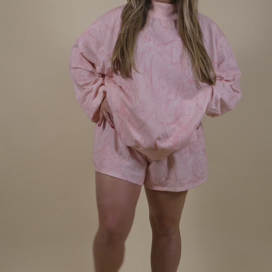 The Pink Camo Mock Neck is the definition of comfy-cute. Made from an ultra-soft fabric with an oversized fit and cozy mock neck collar, this top is perfect for lounging, travel days, or effortless everyday wear. The girly pink camo print is the perfect addition to your lounge lineup. Pair it with the matching Pink Camo Lounge Shorts or Pink Camo Joggers, bundle it with either option to save on the matching set for a cozy look you’ll reach for on repeat. Discount will be applied automatically in cart.