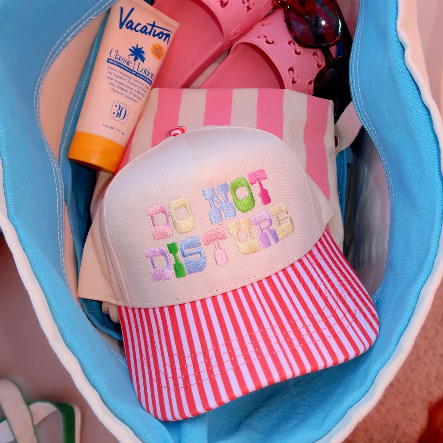 The Do Not Disturb Trucker Hat is the ultimate summer accessory for pool days, beach vacations, and sunny weekend getaways. This cream trucker hat features a pink and red striped bill with multicolored embroidered “Do Not Disturb” lettering. This summer trucker hat is perfect for throwing on with a swimsuit, pairing with denim shorts, or styling with your favorite vacation outfits. Perfect for beach days, lake trips, spring break, or laying by the pool when you’re off-duty.