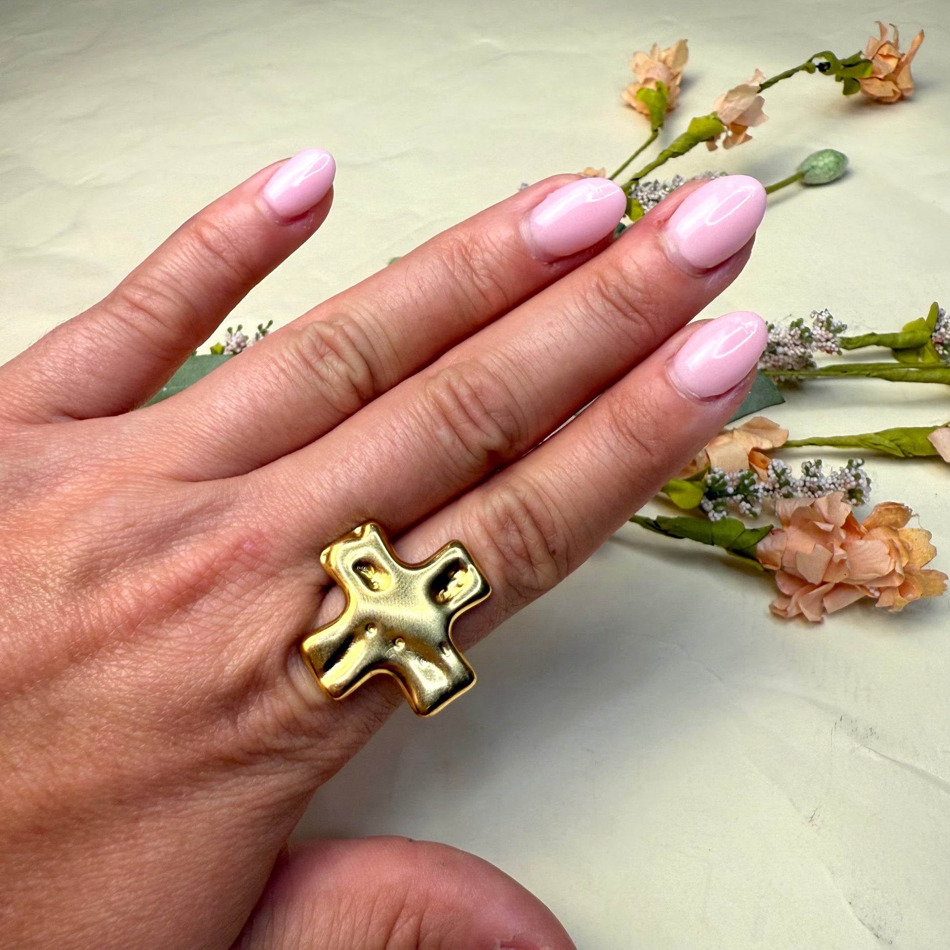 Show your faith in style with the Hammered Cross Ring — a timeless piece that blends simplicity with meaning. Crafted from 18K gold-plated stainless steel, this ring features a subtle hammered texture that catches the light beautifully. Tarnish-free and durable, it’s perfect for everyday wear and layering with your other gold favorites. A sweet reminder of faith that adds a touch of shine to any look.
