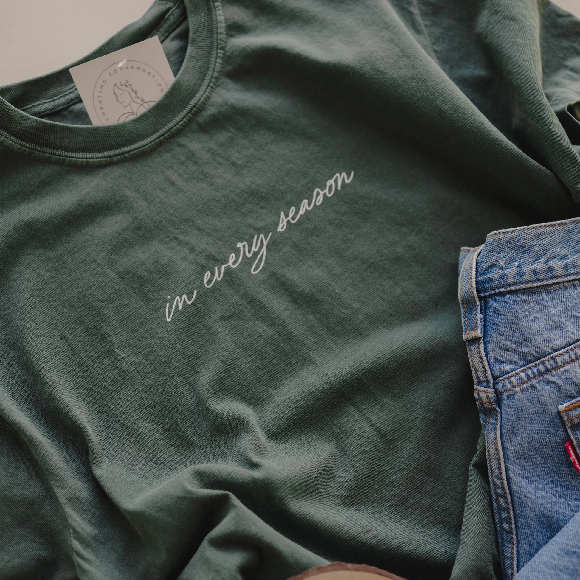 A reminder for your heart in every moment — the In Every Season Tee encourages you to praise Him on the mountaintops and trust Him through the valleys. Printed on a soft green tee with a front-and-back design, it's perfect for any woman needing comfort, encouragement, or a faith-filled everyday piece. He is with you in every season, every circumstance, and every step.