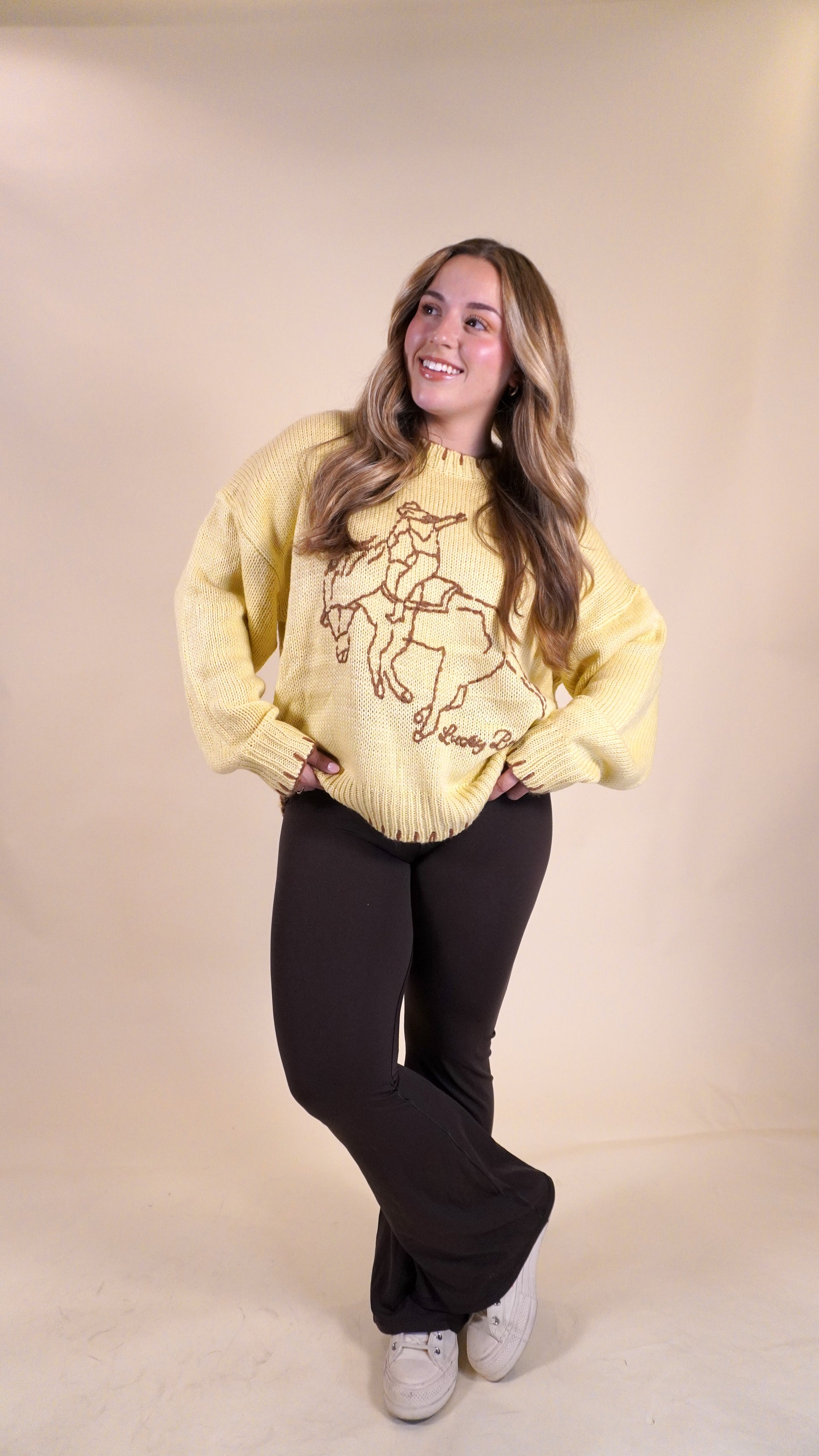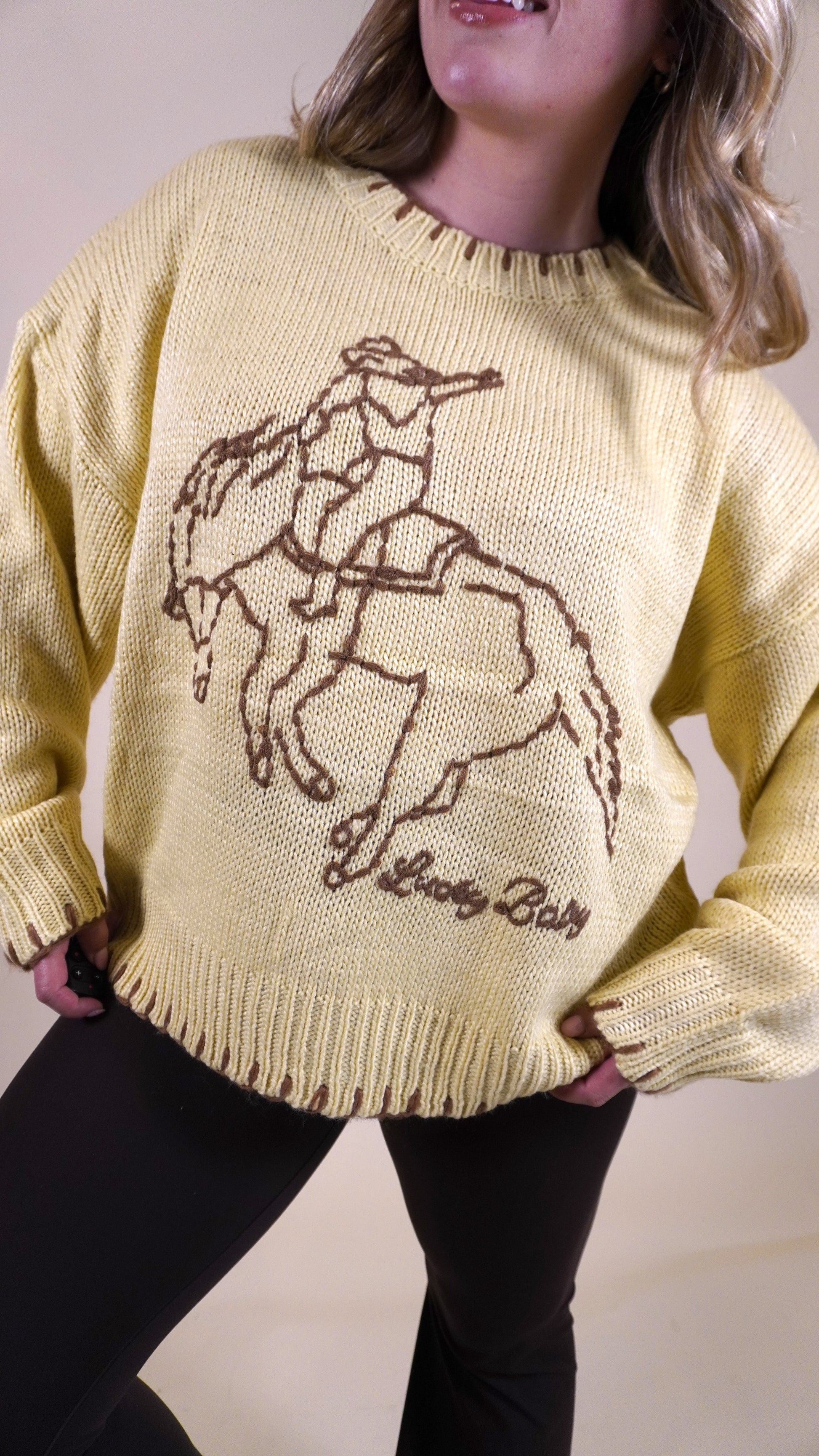 The Lucky Baby Stitch Sweater is that cozy, western-inspired piece you’ll reach for all season long. Featuring a soft butter color with brown stitching on the hems and collar, it’s finished with an adorable cowboy and bucking bronc design that reads “Lucky Baby.” The oversized fit and soft knit make it perfect for fall rodeos, country concerts, or staying in but looking cute.