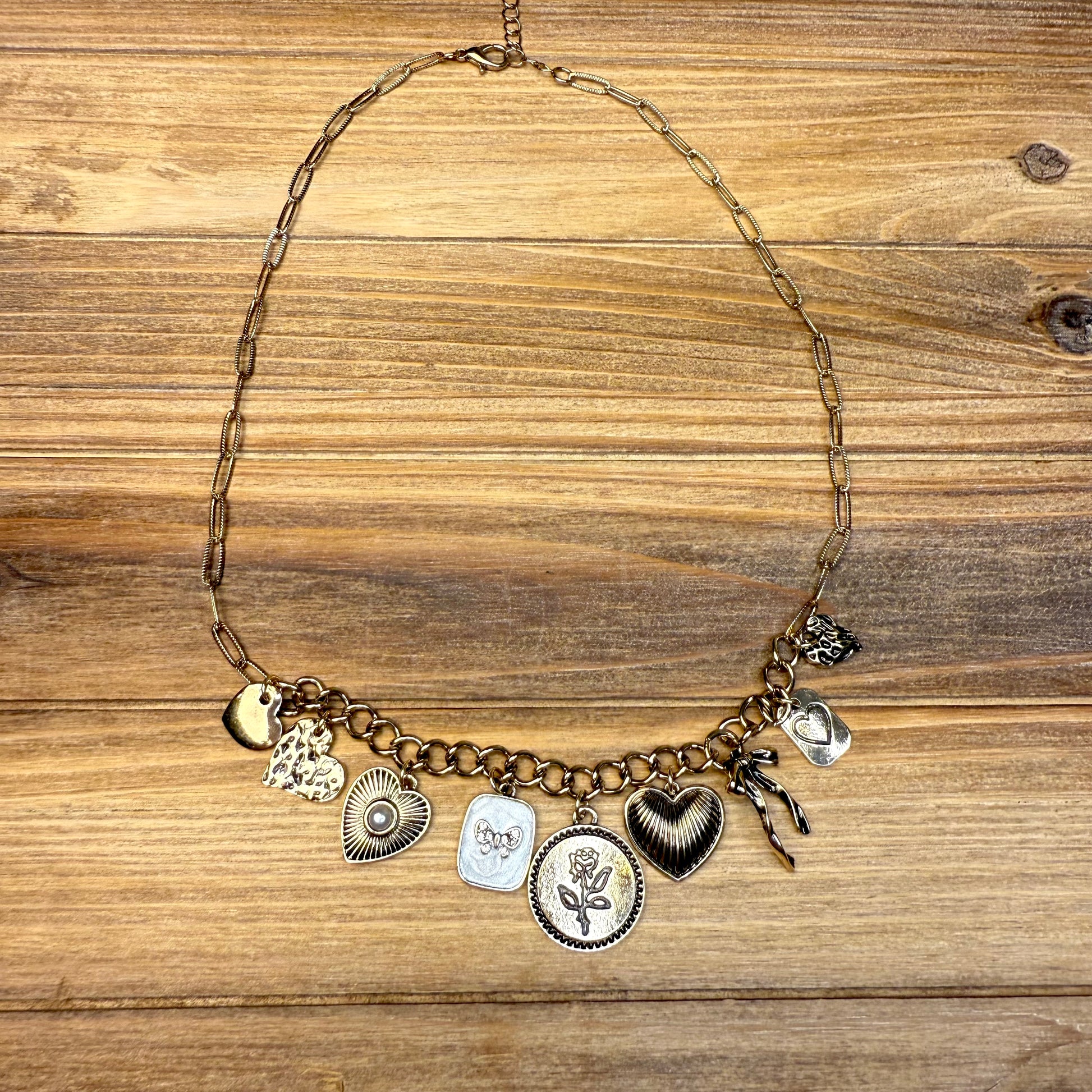 The Promise Charm Necklace is the definition of femininity— featuring a cluster of dainty heart and bow charms adorned with pearls, all suspended from a sleek link chain. Its soft, romantic design adds the perfect girly touch to any outfit, whether you’re dressing up for church, brunch, or just adding a little something to your everyday look.