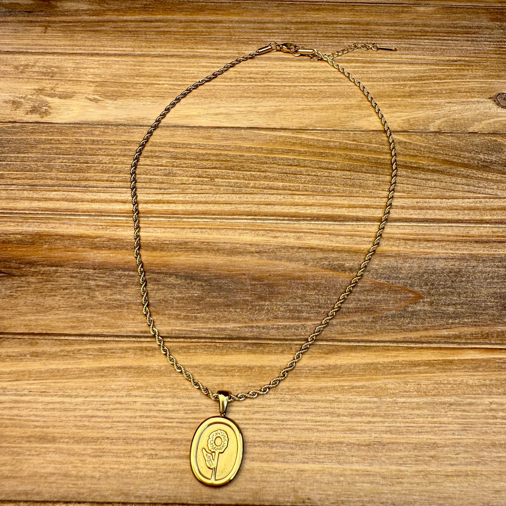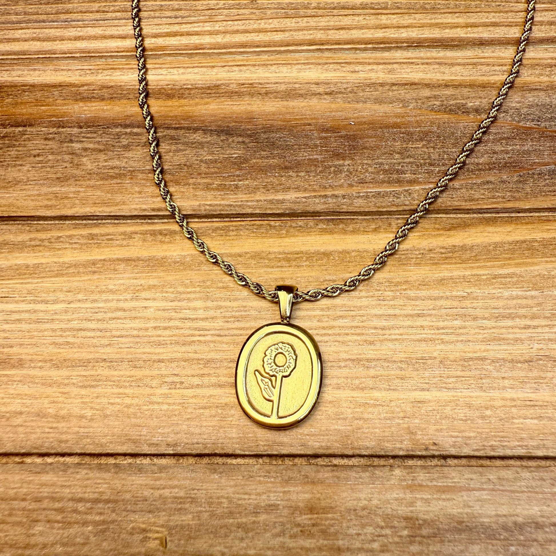 The Sunflower Necklace is a timeless piece that brings a touch of sunshine wherever you go. Featuring a beautifully engraved sunflower on an oval pendant, it’s crafted from 18K Gold coated stainless steel that’s tarnish resistant — meaning it keeps its golden glow wear after wear. Elegant yet simple.